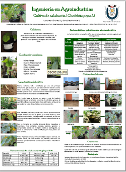 Cultivo de calabacita (Curcubita pepo L.) Describe la anatomía del cultivo, su clasificación, factores bióticos y abióticos que afectan su cultivo, así como las operaciones agrícolas implementadas durante su cultivo. Lascares-Sánchez David y González-Montiel L.